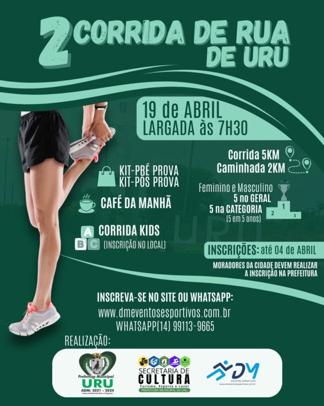 Resultados: 2ª CORRIDA DE URU-MORADOR 2ª CORRIDA DE URU-CLASSIFICAÇÃO GERAL 2ª CORRIDA DE URU-CLASSIFICAÇÃO FAIXA ETÁRIA Link fotos: https://www.focoradical.com.br/prova/20260419-2o-corrida-de-rua-de-uru-uru-8992 Link resultados: https://picrono.com.br/home/#resultados