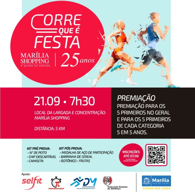 Resultados: Resultado-CLASSIFICAÇÃO FAIXA ETÁRIA-MARILIA SHOPPING Resultado-CLASSIFICAÇÃO GERAL-MARILIA SHOPPING Link resultados: https://picrono.com.br/racetag/#/corre-que–festa-marlia-shopping-25-anos Link fotos: https://www.focoradical.com.br/prova/20250921-corre-que-e-festa-marilia-shopping-25-anos-marilia-4677