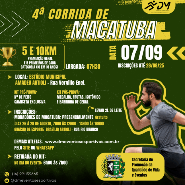 Resultados: Resultado-CLASSIFICAÇÃO MORADOR – MACATUBA Resultado-CLASSIFICAÇÃO GERAL – MACATUBA Resultado-CLASSIFICAÇÃO FAIXA ETÁRIA – MACATUBA Resultado-PCD – MACATUBA Link resultados: https://picrono.com.br/racetag/#/4-corrida-de-macatuba Link fotos: https://www.focoradical.com.br/prova/20250907-4a-corrida-de-macatuba-macatuba-4677