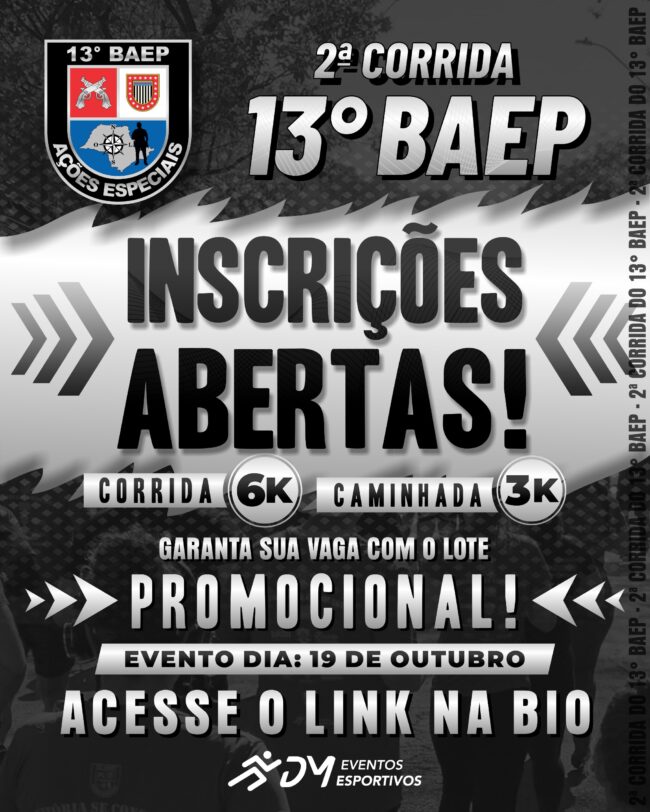 Resultados: Resultado-CLASSIFICAÇÃO GERAL – POLÍCIA MILITAR – BAEP Resultado-CLASSIFICAÇÃO GERAL – PCD – BAEP Resultado-CLASSIFICAÇÃO FAIXA ETÁRIA – BAEP Resultado-CLASSIFICAÇÃO GERAL – ELITE – BAEP Resultado-CLASSIFICAÇÃO GERAL – BAEP Link resultados: https://picrono.com.br/racetag/#/2-corrida–13-baep Link fotos: https://www.focoradical.com.br/prova/20251019-2a-corrida-13o-baep-bauru-4677
